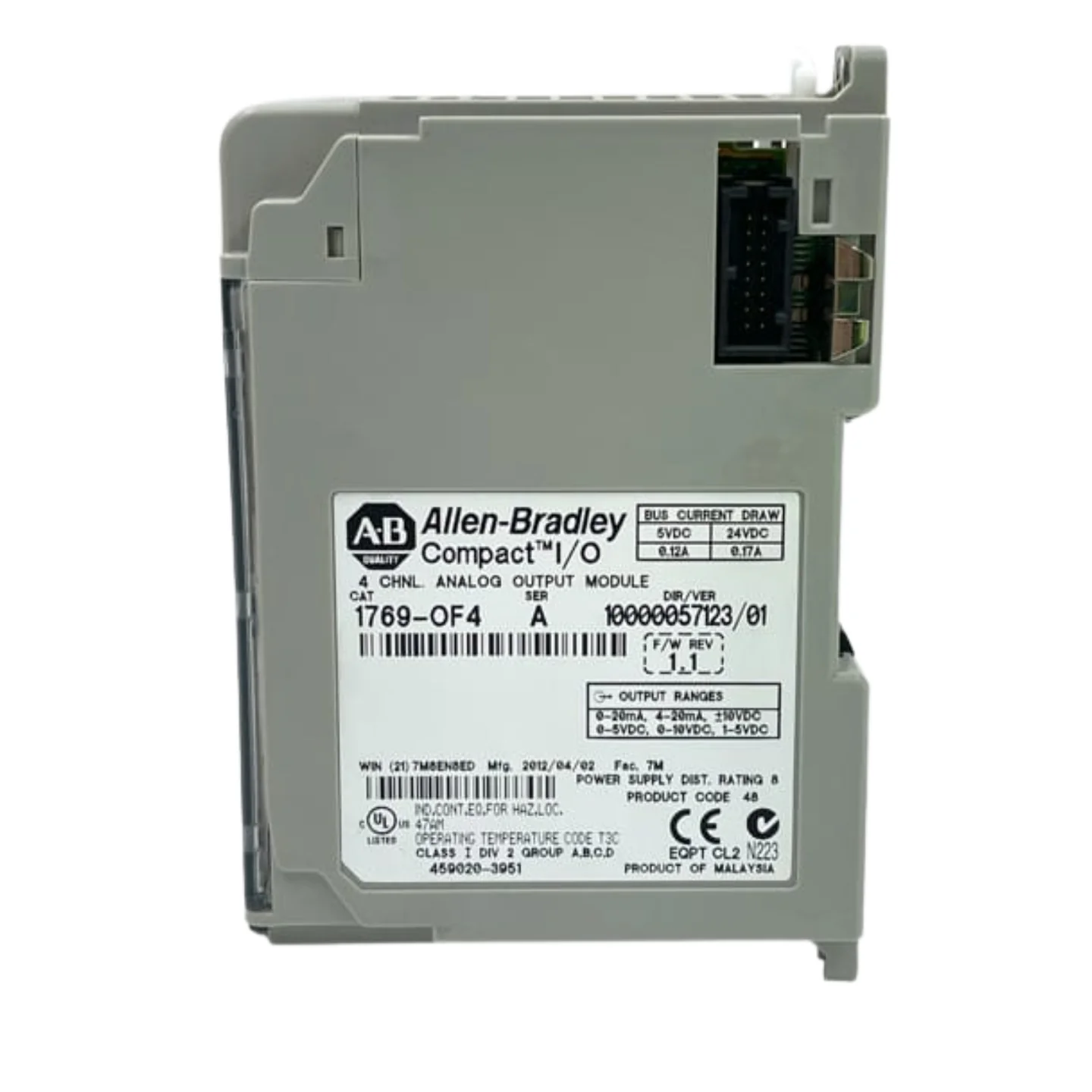 Allen Bradley 1769-OF4 ?C Compact I/O analog output module, 4 channels, voltage (??10V) or current (4?C20 mA), 14-bit resolution, requires external 24V DC power. Compatible with CompactLogix and MicroLogix 1500 systems. Ideal for precise analog signal control.